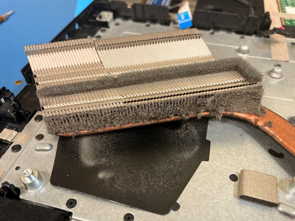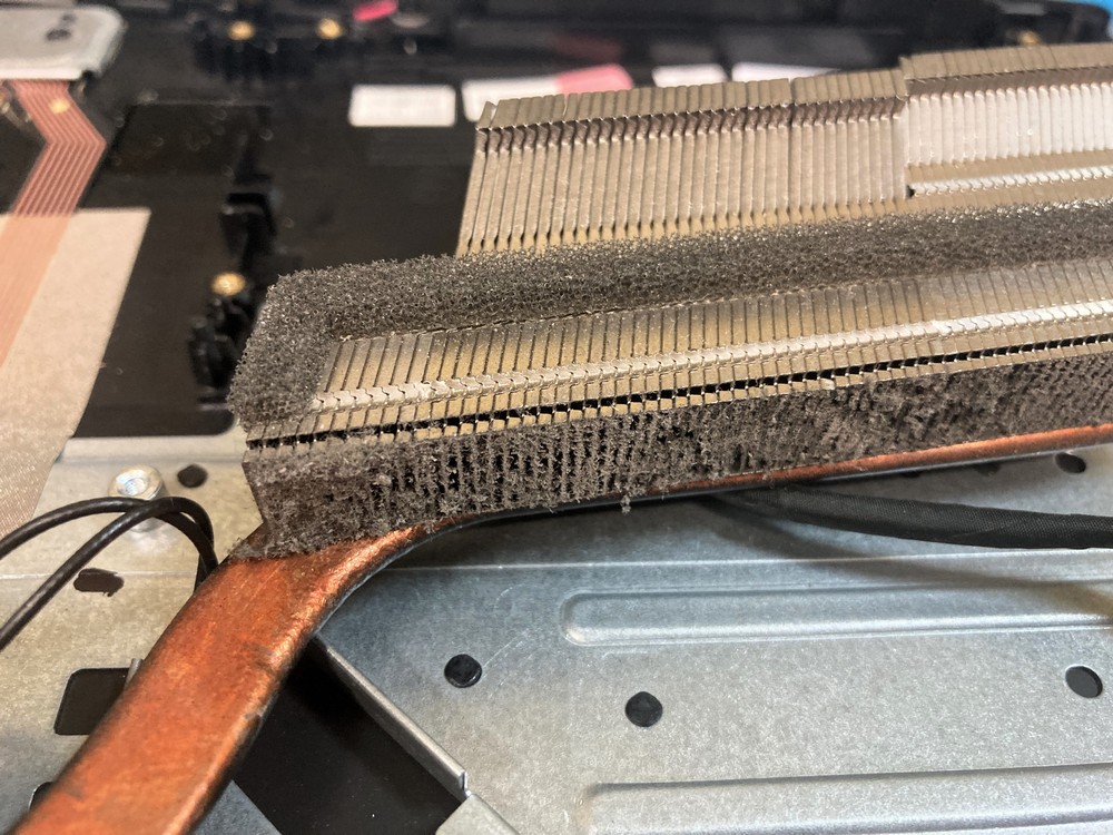 Laptop bardzo mocno się nagrzewał i wyłączał podczas grania. Właściciel laptopa powiedział nam, że musi robić przerwy w trakcie grania i problem przegrzewania występuje już od dawna ale nie miał czasu do nas przyjechać. A to błąd, ponieważ praca układu graficznego w wyższych niż to przewidział producent temperaturach w końcu doprowadzi do jego uszkodzenia. Laptop w środku był już mocno brudny. Przy intensywnym użytkowaniu nazbierało się sporo kurzu, który uniemożliwiał prawidłowe chłodzenie.